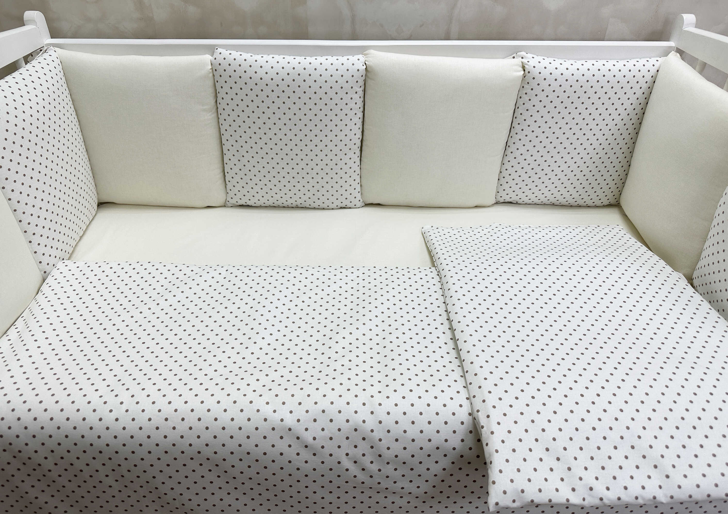 Комплекты в детскую кроватку для новорожденных с бортиками подушечками